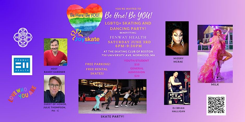 Joy Skate Productions welcomes YOU to a celebratory fun-raiser with skating and dancing. Be Here! Be YOU! is a charitable event supporting the LGBTQ+ community, and will be held at The Skating Club of Boston in Norwood, MA on Saturday, June 3. General Admission is $20, Students $10 (with high school or college ID) and includes parking, DJ, hot chocolate, rental skates, and a skating session. Other Club amenities include cash bar, café and gender-neutral restrooms are available. Proceeds will benefit Fenway Health.