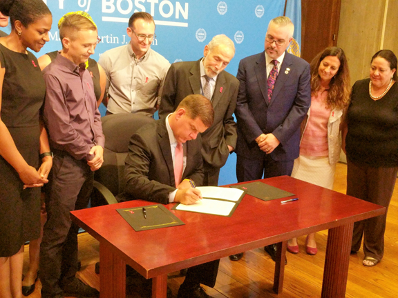 Before signing the Paris Declaration on Fast-Track Cities at City Hall August 31, Boston Mayor Martin J. Walsh wanted to make something clear: He’s grateful not just for the work of those in his administration who are pushing policies to end the transmission of HIV, but also for the advocacy of the Getting to Zero Coalition.