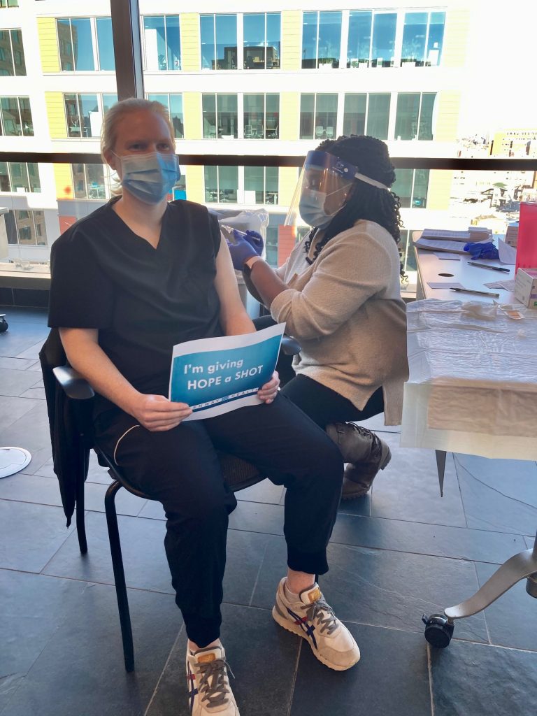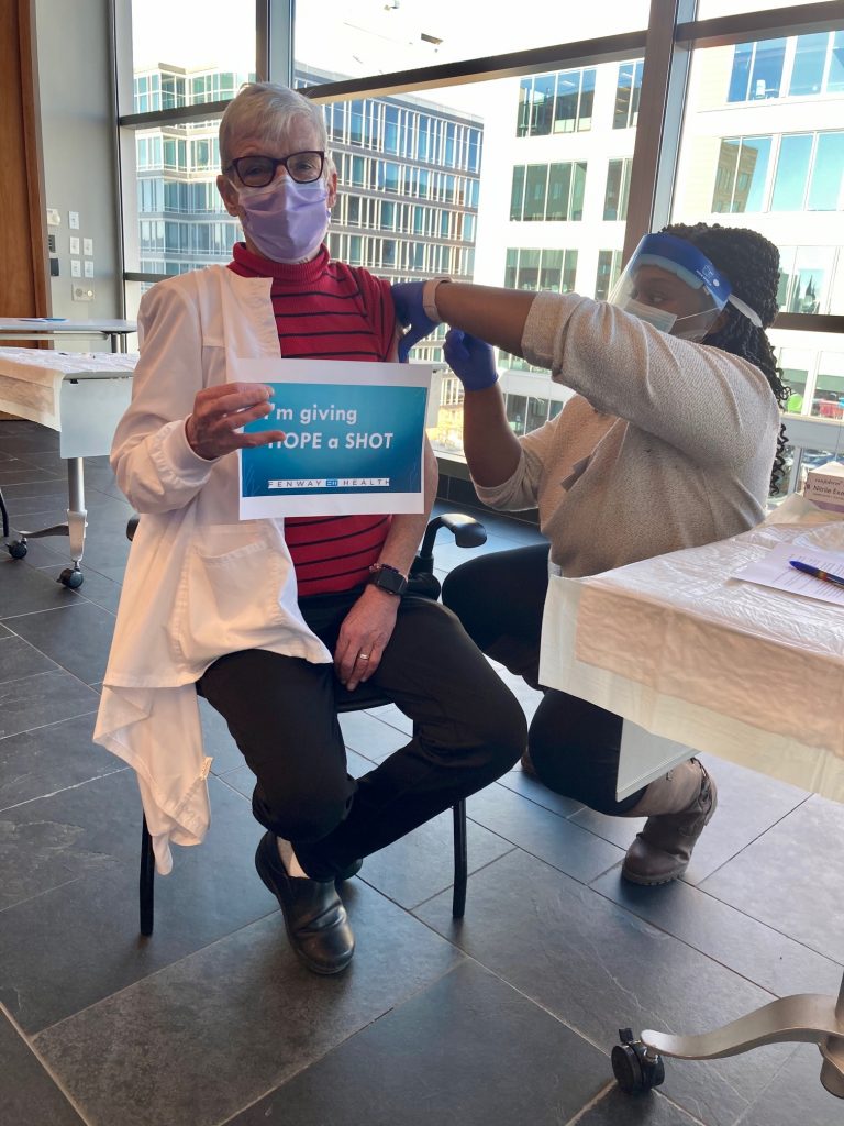 Janet Dargon, Fenway Institute Clinical Trials Support Coordinator, was the first to receive the shot, which was administered by Kimella Dixon, Nurse Manager.