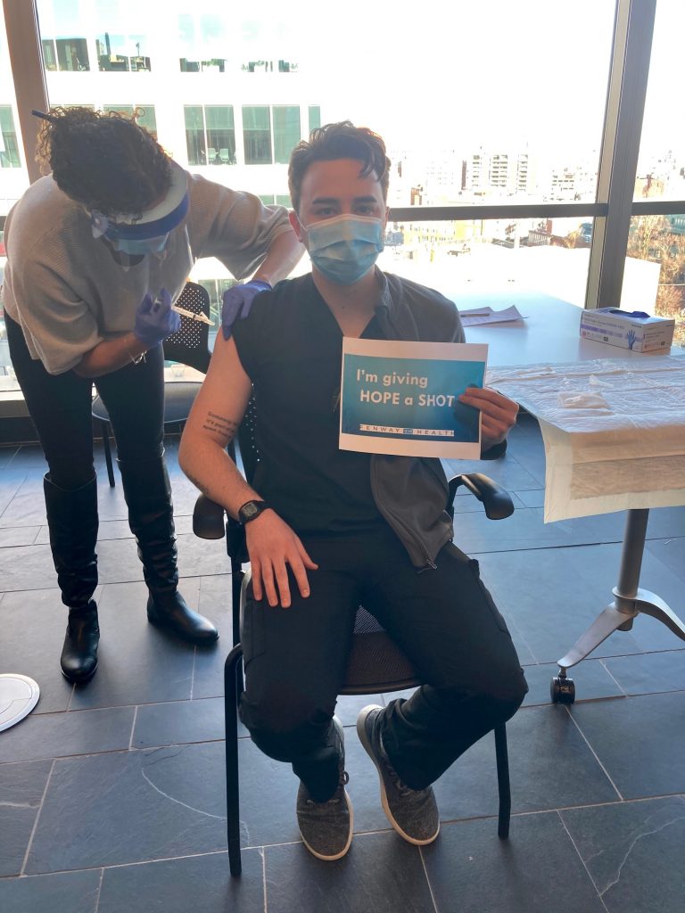 John Hortareas, Medical Assistant at Fenway: South End, received his shot next.