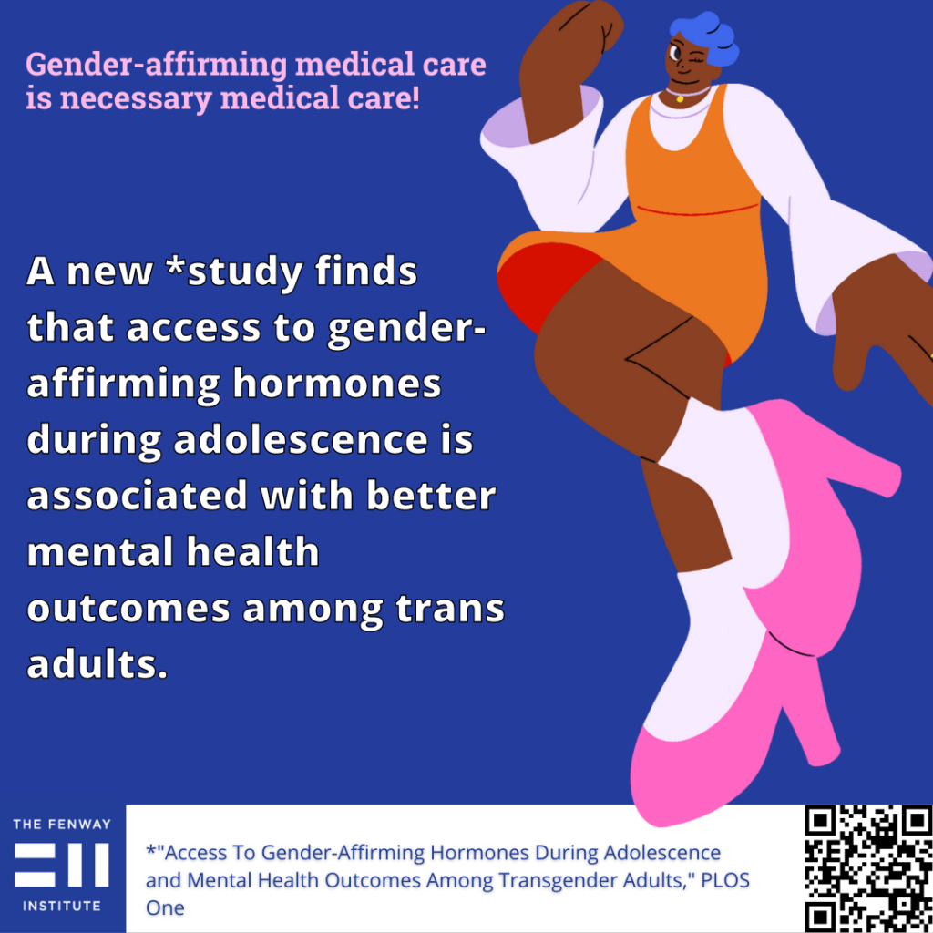 BOSTON, January 12, 2022—A study published today in PLOS One found that access to gender-affirming hormones during adolescence is associated with better mental health outcomes among transgender adults. It is the first large-scale controlled study of gender-affirming hormone initiation during adolescence, the first study to compare access to gender-affirming hormones during adolescence versus adulthood, and adds important new knowledge to the evolving field of transgender health care.