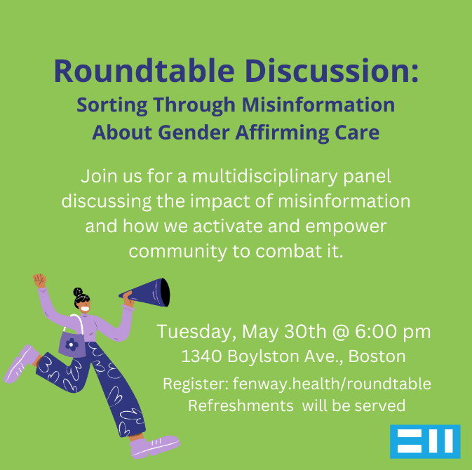 Finding the facts about gender affirming healthcare amidst swirling media and social commentary can be difficult. You’re invited to join Fenway Health and a multidisciplinary panel as we sift through the noise surrounding trans and gender diverse (TGD) care. The panel will discuss the impact of misinformation and how to activate and empower community members to combat it. An audience Q&A will be part of the evening, so please bring any questions you may have for the panel!