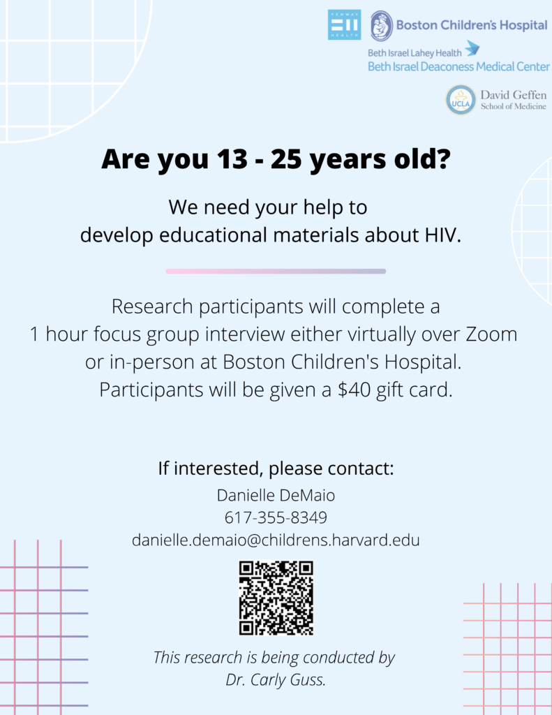 Research participants will complete a 1 hour focus group interview either virtually over Zoom or in-person at Boston Children’s Hospital. Participants will be given a $40 gift card.