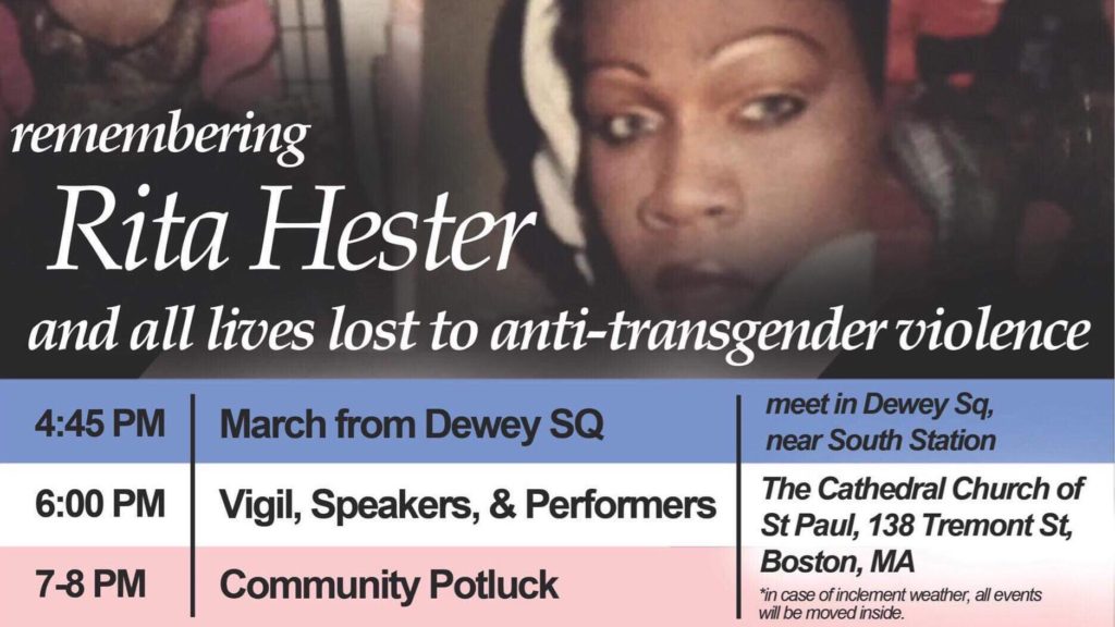 This Sunday, November 18, we invite you to join us at the 20th Boston Transgender Day of Remembrance. Every year in November, the Boston transgender and gender non-conforming community comes together to mourn those who have been taken from us due to anti-transgender violence. This tradition began in 1998, with the murder of Rita Hester in Allston, Massachusetts. Now, two decades later, the Day of Remembrance is honored worldwide. This is a day to remember the lives of the hundreds of transgender and gender nonconforming people who are taken from us every year. This year we will be honoring those lives with a march from Dewey Square, a vigil, speakers, performers, and a community potluck. In addition, there will be a Transgender Day of Remembrance on Cape Cod on Tuesday, November 20.