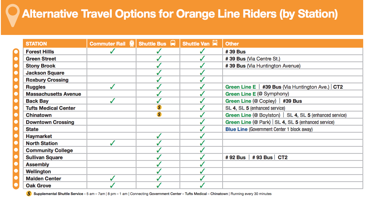 The MBTA has put together a Rider’s Guide for Planning Ahead to help riders navigate these closures and plan their travel accordingly. Below is the complete list of suggested alternate routes to each Orange Line station:
